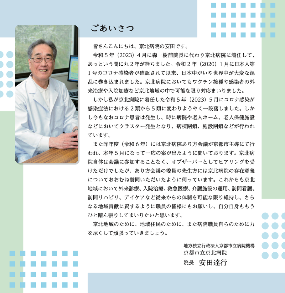 令和5年(2023年)4月より前任の森一樹院長先生を引き継いで、京都市立京北病院の院長を拝命し赴任した安田達行と申します。これからよろしくお願いいたします。